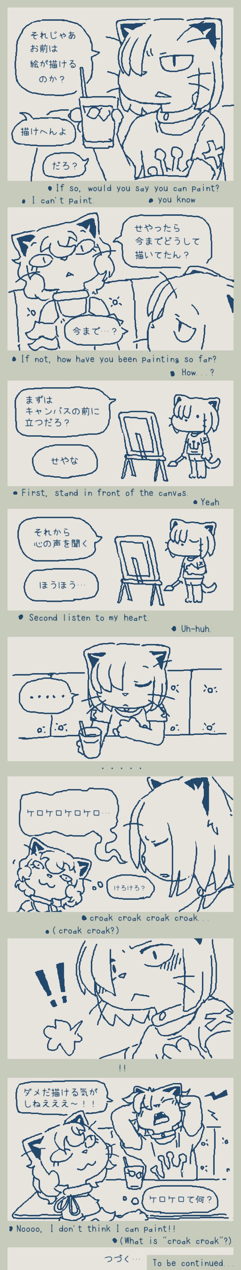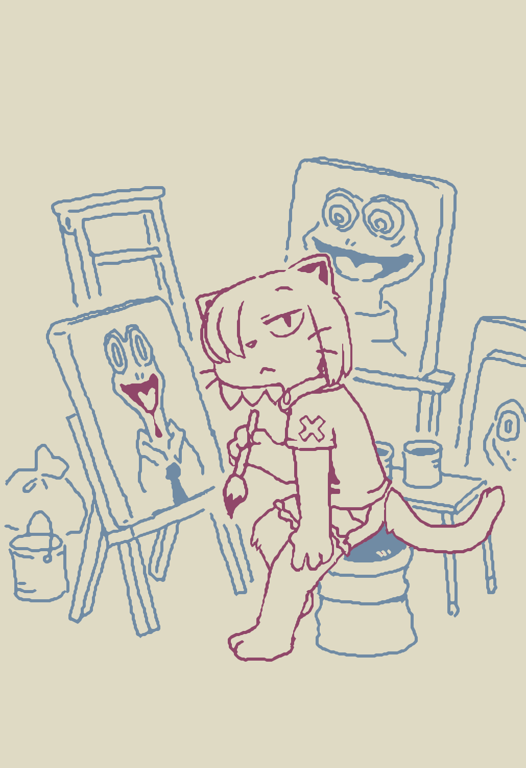 カエルが描かれたキャンバスに囲まれて、カエルの絵を描くチョコグレ。