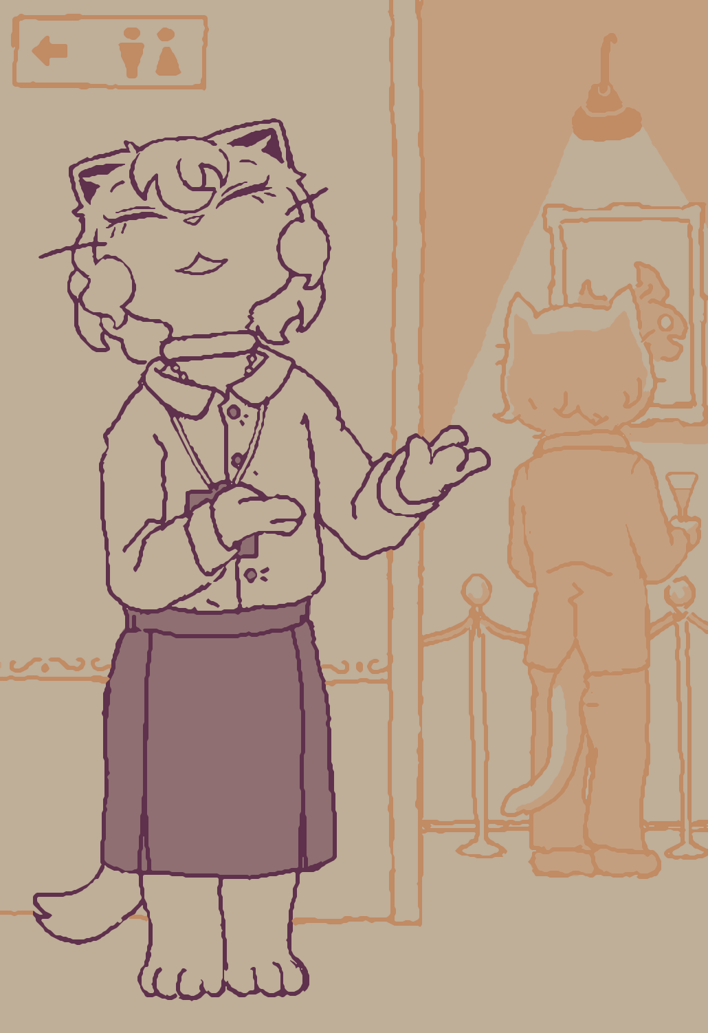 ガミラがギャラリーを案内する姿。奥の部屋にはかざられた絵とそれを鑑賞する人影。