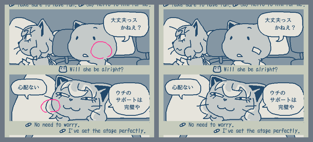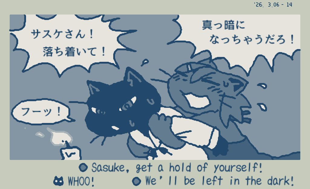 Updated my siteâš I forgot to draw Isaoâs bandage (from when Choco kicked his face during brushing) and Gamilaâs whiskers, so Iâve added them back in. https://studiopixel.jp/amechoga/