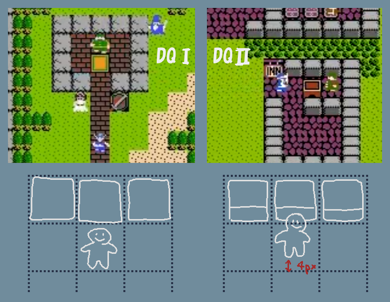3、ドラクエ2ではキャラを4ピクセル上にズラして配置することで立体的になった!